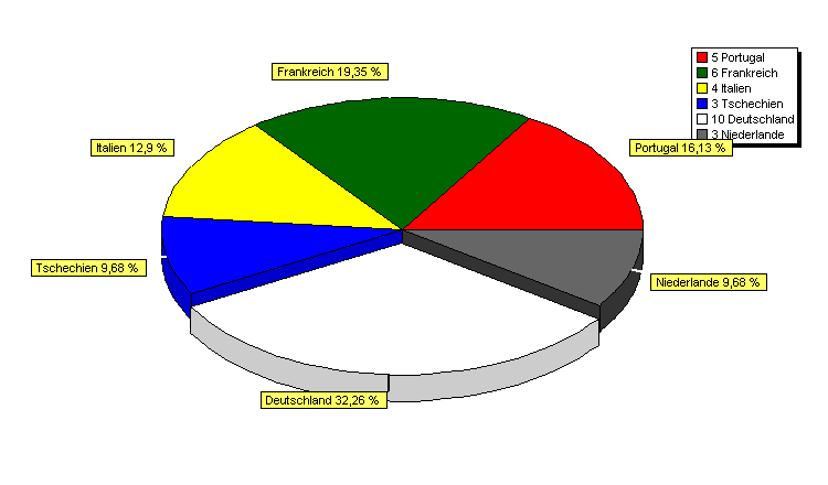 Dieses Diagramm zeigt das von den Teilnehmern am meisten favorisierte Team. Die Prozentangabe gibt wieder, wieviele von den 31 Teilnehmern denken, wer Weltmeister wird.